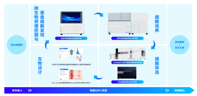 包括基于视觉识别的高通量液滴分选系统,实现免荧光标记的筛选;微生物培养分析系统,实现单菌的高通量分离与培养分析;以及与自动化工作站接驳的生物数据功能岛模块,实现无人值守,满足规模化数据通量的需求。